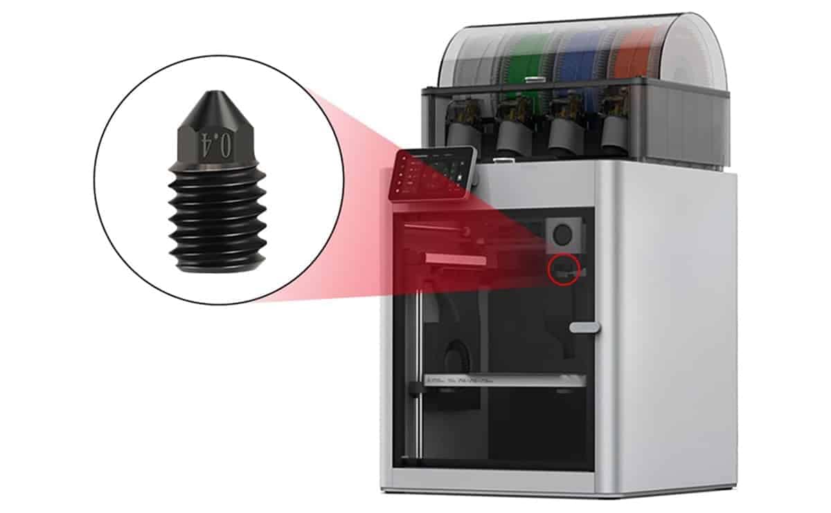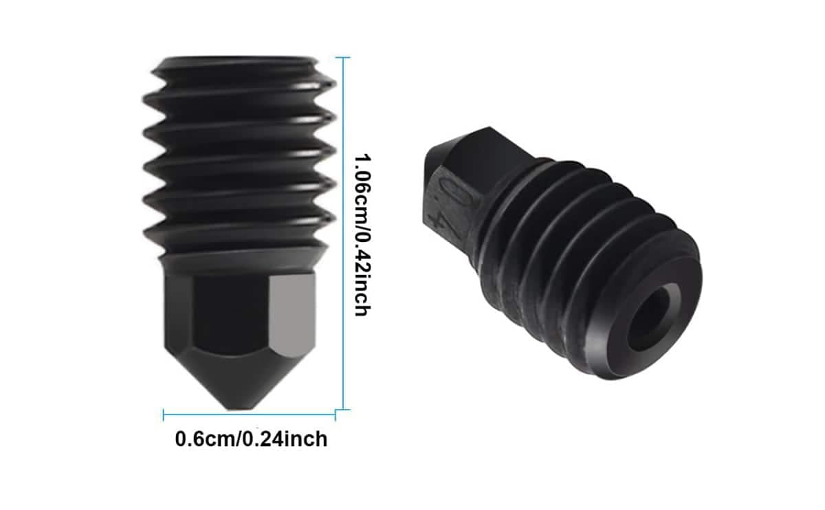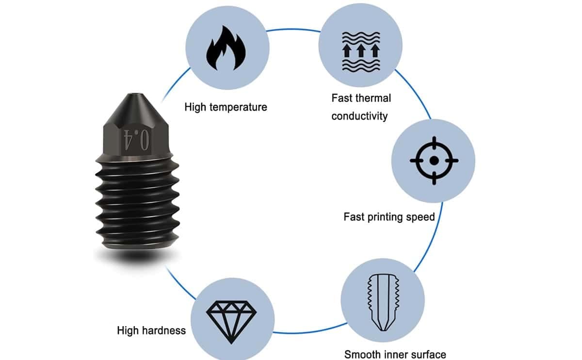 - The hardened steel construction of the nozzle enables it to withstand high temperatures, making it suitable for a wide range of printing materials.