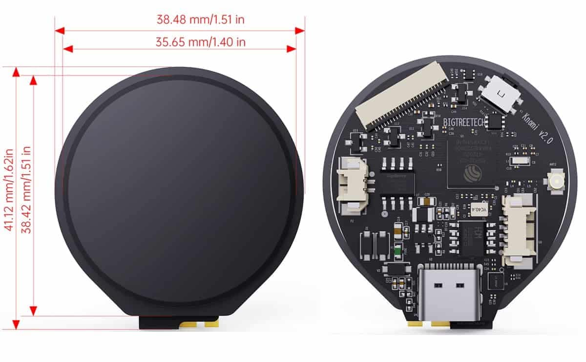 - Bigtreetech KNOMI V2.0 touch screen display adopts ESP32-S3R8 dual core processor with a main frequency of up to 240MHz Xtensa 32-bit LX7 main control chip, GC9 A01 driver chip, 1.28inch, 180C°All View,240RGB*240 DOTS,Flash:16MB,PSRAM:8MB.