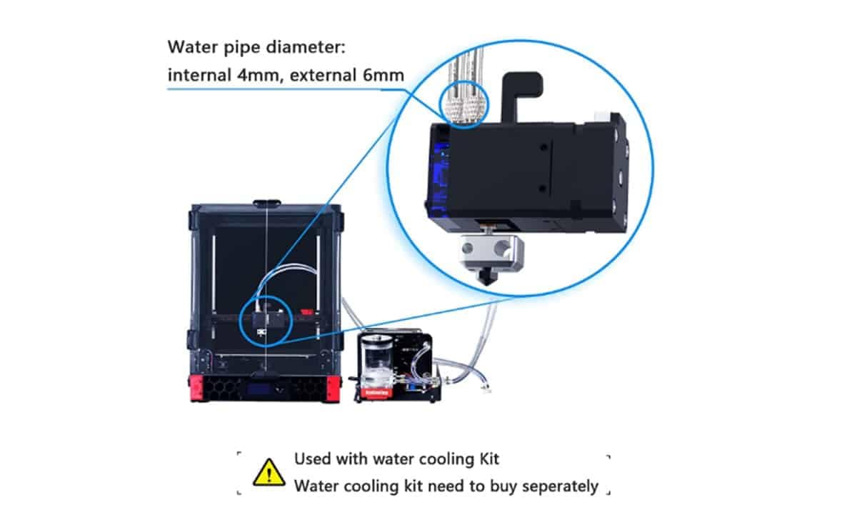 - Water cooling system: used with water cooling kits for superior heat dissipation, keeping a low extruder working temperature under 50°C