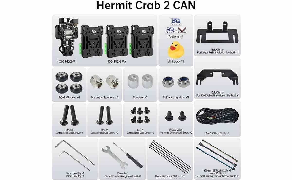 - Bigtreetech Hermit Crab V2 Can Version set includes three tool plates and a fixed plate to meet your needs for quickly changing and using multiple print heads on one printer.