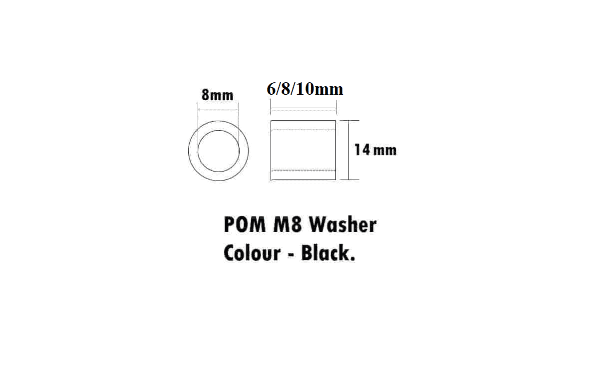 Plastic spacer with 8mm bore, 10mm length and 14mm outer dia. A solid material used to separate two parts in an assembly. It varies size from microns to centimeters. It is made of metal, plastic, glass and other materials. Shapes include flat sheet, cylindrical and spherical. pom spacer 6mm contribute a lot to from an excellent and  dual-seal system in insulating glass units.