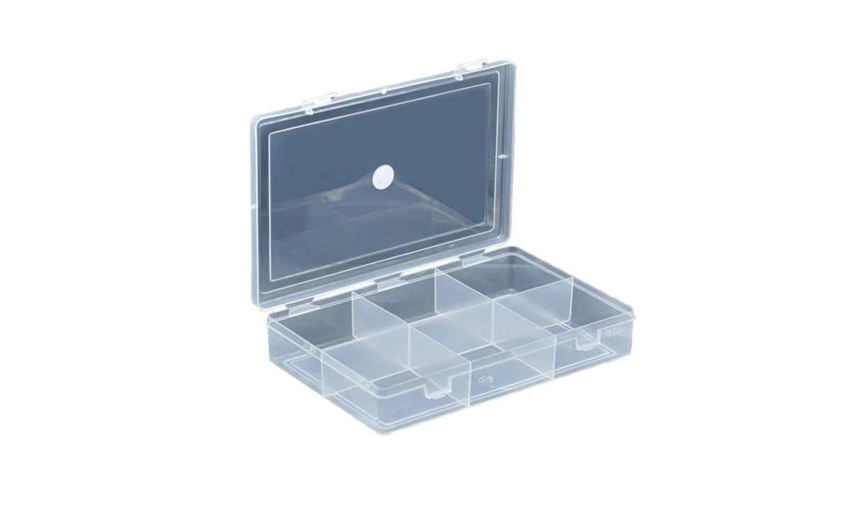 Plastic Transparent Box with Partition. Designed for versatility, this durable and lightweight storage solution is perfect for storing connectors, fasteners, stationery items, and drivers.