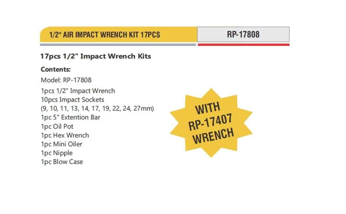 Home » Pneumatics » Pneumatic Tools » Professional Pneumatic Tools 1/2″ AIR IMPACT WRENCH 17PCS KIT RP-17808