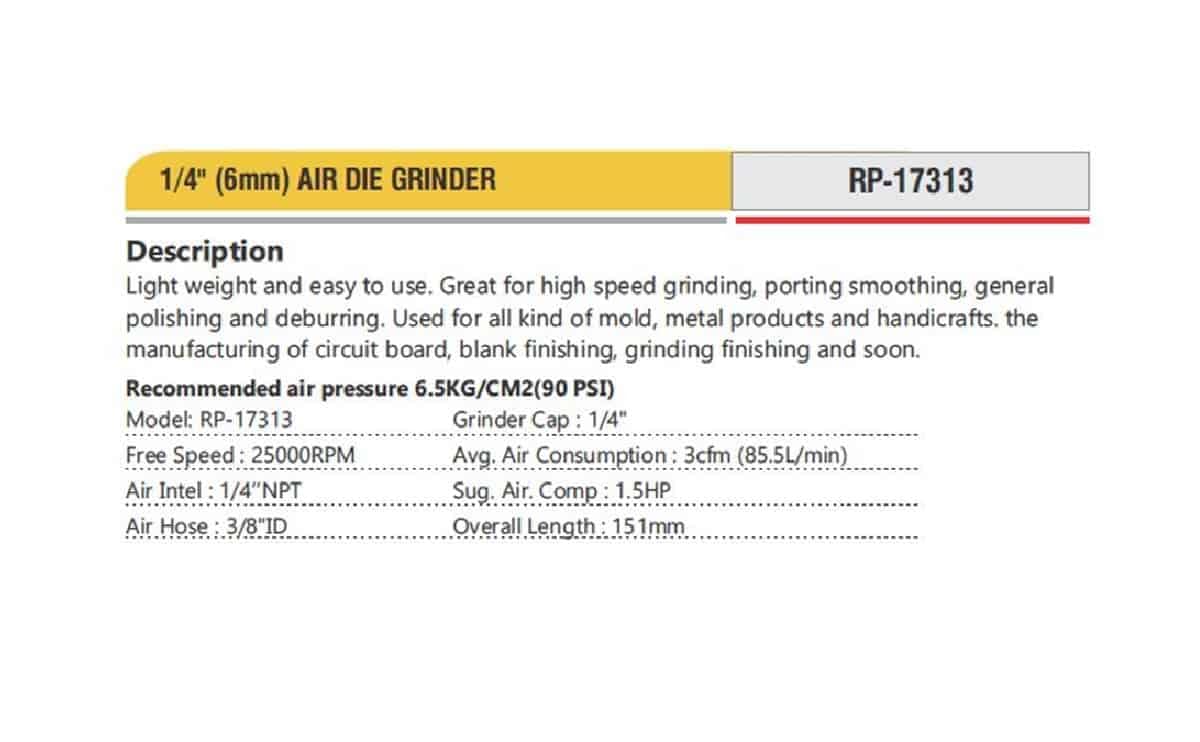 Home » Pneumatics » Pneumatic Tools » Professional Pneumatic Tools 1/4″ (6mm) AIR DIE GRINDER RP-17313
