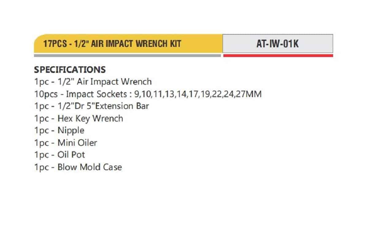 Home » Pneumatics » Pneumatic Tools » Professional Pneumatic Tools 17PCS – 1/2″ AIR IMPACT WRENCH KIT