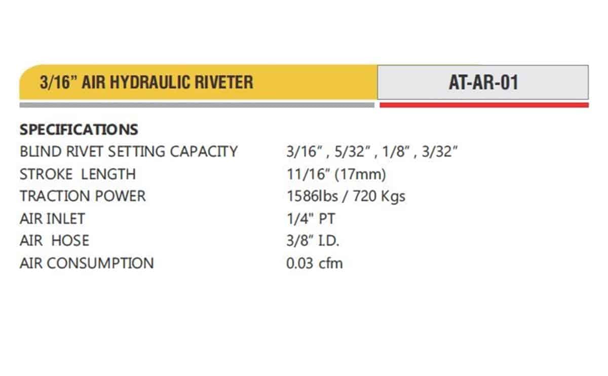 Home » Pneumatics » Pneumatic Tools » Professional Pneumatic Tools 3/16” AIR HYDRAULIC RIVETER AT-AR-01