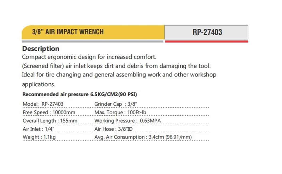 Home » Pneumatics » Pneumatic Tools » Professional Pneumatic Tools 3/8” AIR IMPACT WRENCH RP-27403