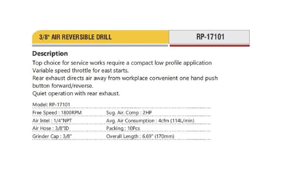 Home » Pneumatics » Pneumatic Tools » Professional Pneumatic Tools 3/8″ AIR REVERSIBLE DRILL RP-17101