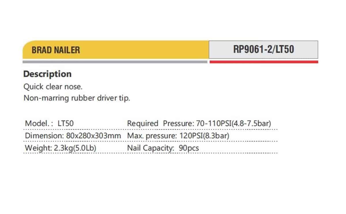 Home » Pneumatics » Nailer & Staplers » Professional Pneumatic Tools BRAD NAILER RP9061-2/LT50