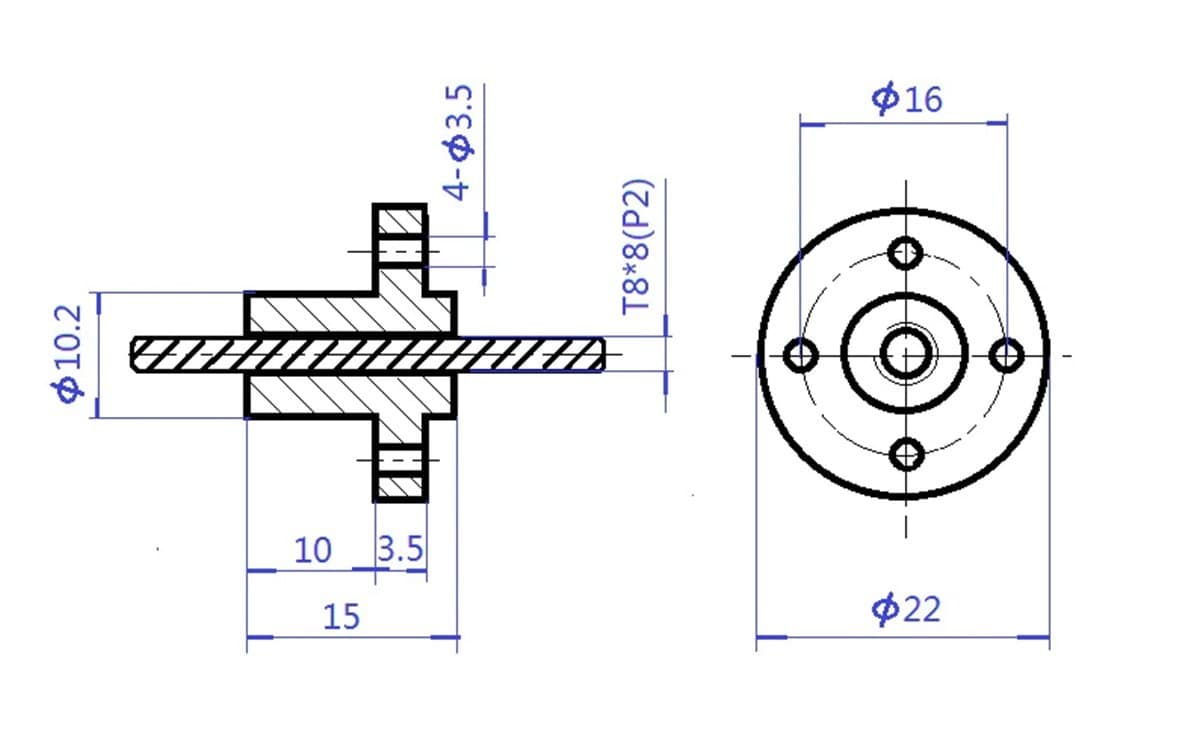 - Single Start Thread with a 2mm pitch and 2mm lead (nut moves 2mm per rotation).